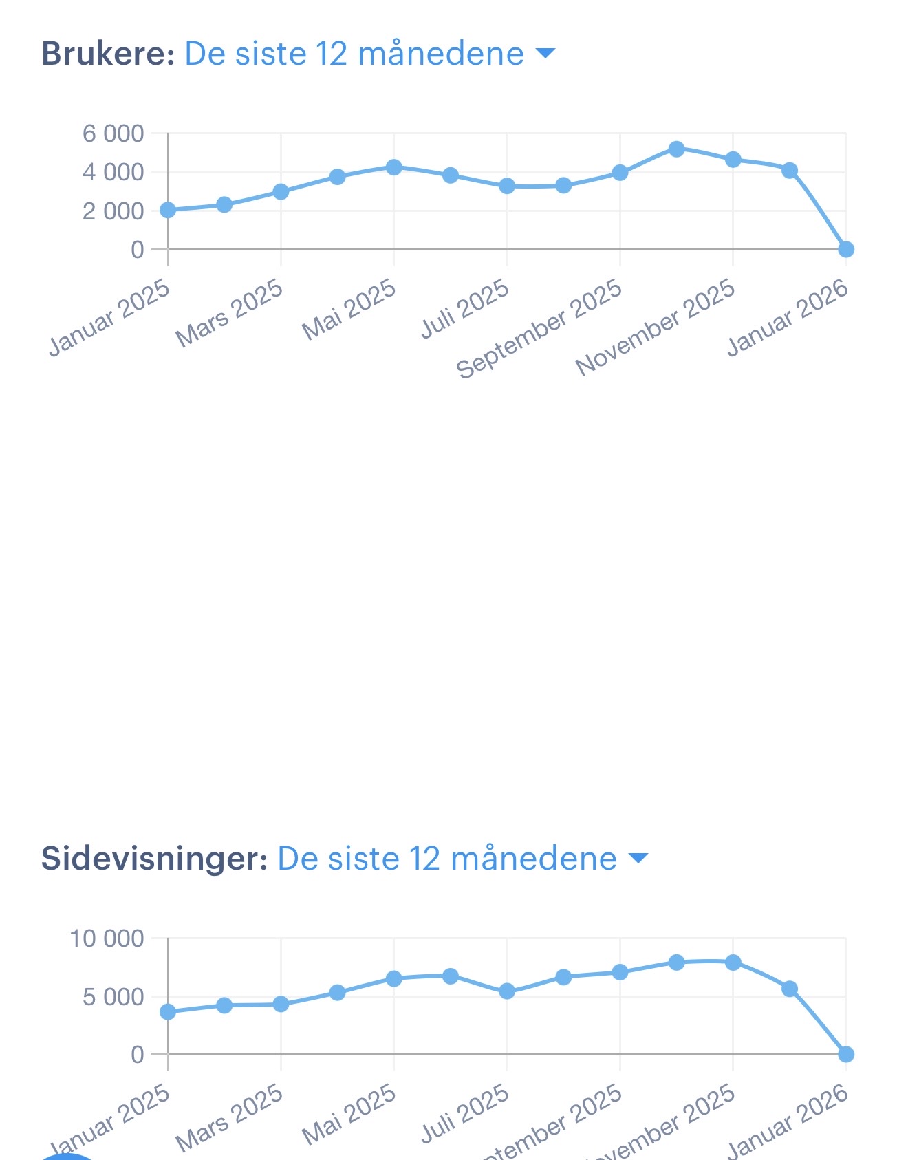 Antall brukere viser en jevn og stabil økning gjennom året. Trafikken starter på rundt 2 000 brukere i januar, øker gradvis gjennom våren og når et første toppnivå i mai–juni på over 4 000 brukere. Sommeren viser en moderat utflating, før ny vekst fra september. Årets høyeste nivå registreres i oktober–november med over 5 000 brukere.