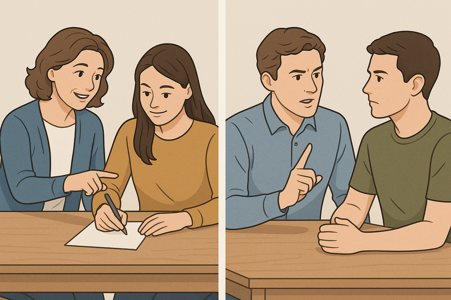 Foto: Bildet viser forskjellen mellom veiledning og det å gi råd. Til venstre ser man en person som rolig viser og hjelper en annen til å forstå og lære selv – dette symboliserer veiledning. Til høyre ser man en person som peker og snakker bestemt til en annen – dette symboliserer det å gi råd, altså å si...